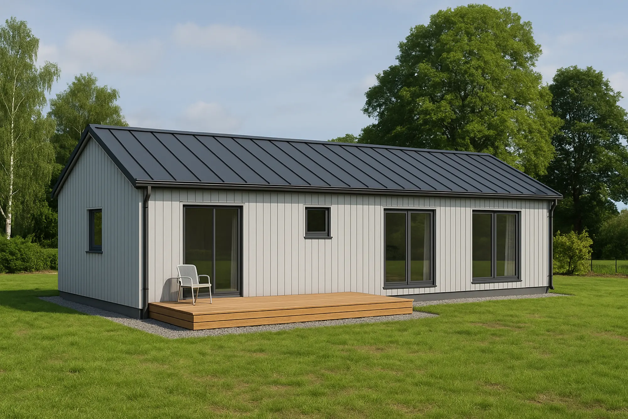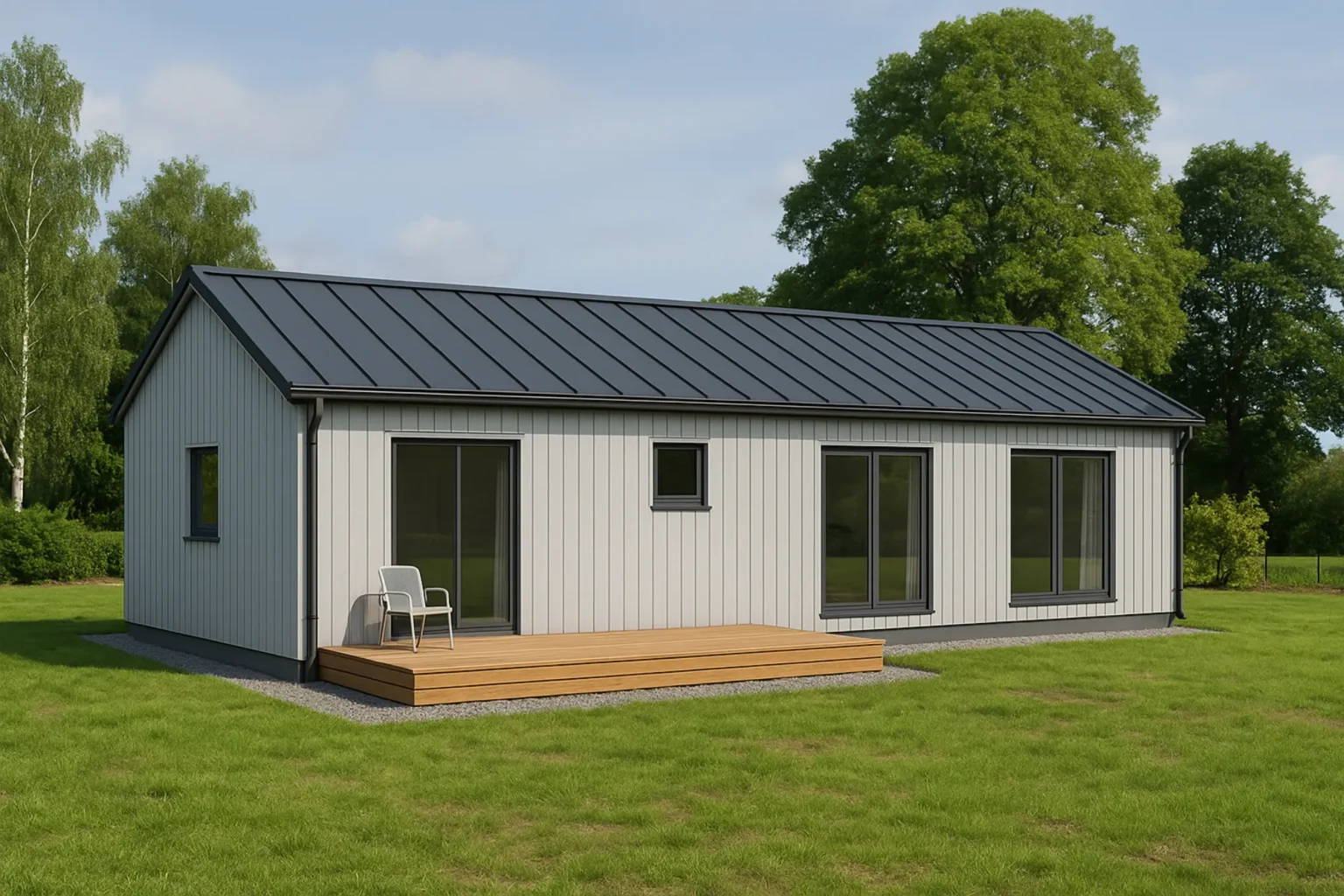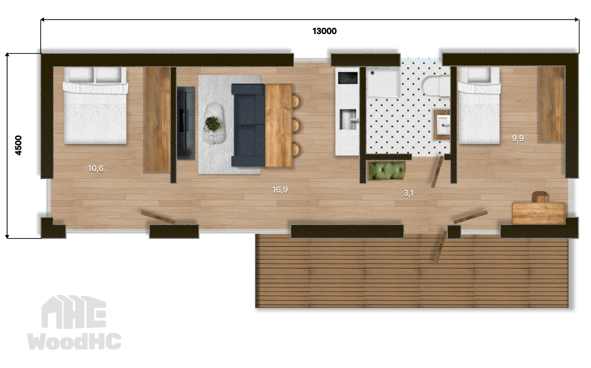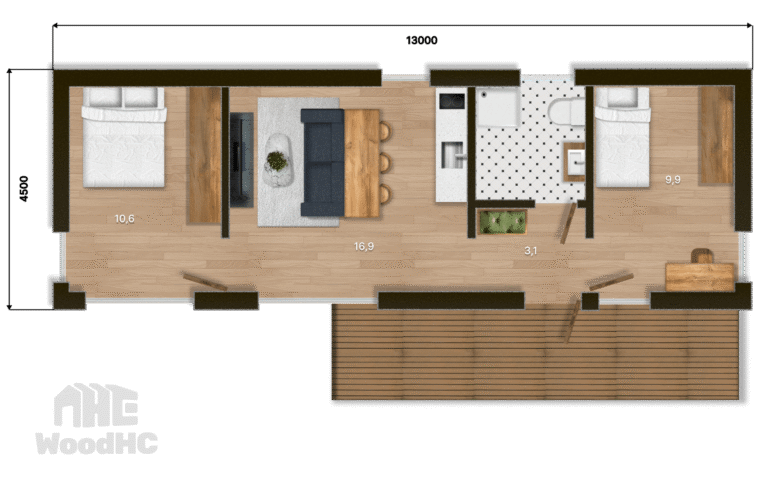 Šī kompaktā moduļu māja ar kopējo platību 44,7 m² ir ideāli piemērota tiem, kas meklē modernu un ērtu dzīvesvietu nelielā platībā. Mājai ir rūpīgi izstrādāts plāns, kas nodrošina ērtu pārvietošanos starp telpām un maksimālu dzīvojamās platības izmantošanu. Piedāvā atvērtu dzīvojamo zonu ar virtuvi, kā arī vannas istabu un 2 guļamistabām.